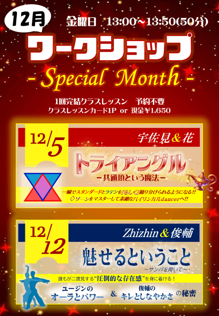 12月のワークショップはSpecialバージョンでお届けします!! 今回はなんと、インストラクターがコラボレーション☆ 本当に「今しか聞けない」クラスレッスンです。 5日は宇佐見と花のコラボ☆ スタンダードとラテン、共通項もあれば、スタンダードではとって... -
