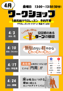 4月14日(日)開催 チャリティーパーティー 2024 3/23 お知らせ イベント 2024年3月23日 宮城県ボールルームダンス連盟が主催のダンスパーティーのお知らせです。 トークネットホール仙台の地下展示室で開催です。 たっぷりダンスタイムの他に、トライアルもございます。 チケットは申込み制のため、3月28日(木)までにご予約くださいね。 お知らせ イベント よかったらシェアしてね! URLをコピーしました! URLをコピーしました! フリーダンス4月、5月のスケジュール 4月からクラスレッスンの担当が変わります 関連記事 4月11日 ELEGANCE&GLOOVE DANCE LIVE チケット販売開始 2026年3月10日 3月からNewクラスが3つも登場! 2026年3月2日 3月のワークショップ 2026年2月26日 NEWクラスレッスンスケジュール 2026年2月25日 クラスレッスンのオトクなキャンペーン 2026年2月3日 2月、3月のフリーダンス予定 2026年1月31日 小野澤&宇佐見 2月11日(水・祝)スペシャルゲスト!! 2026年1月29日 2月のワークショップ 2026年1月29日